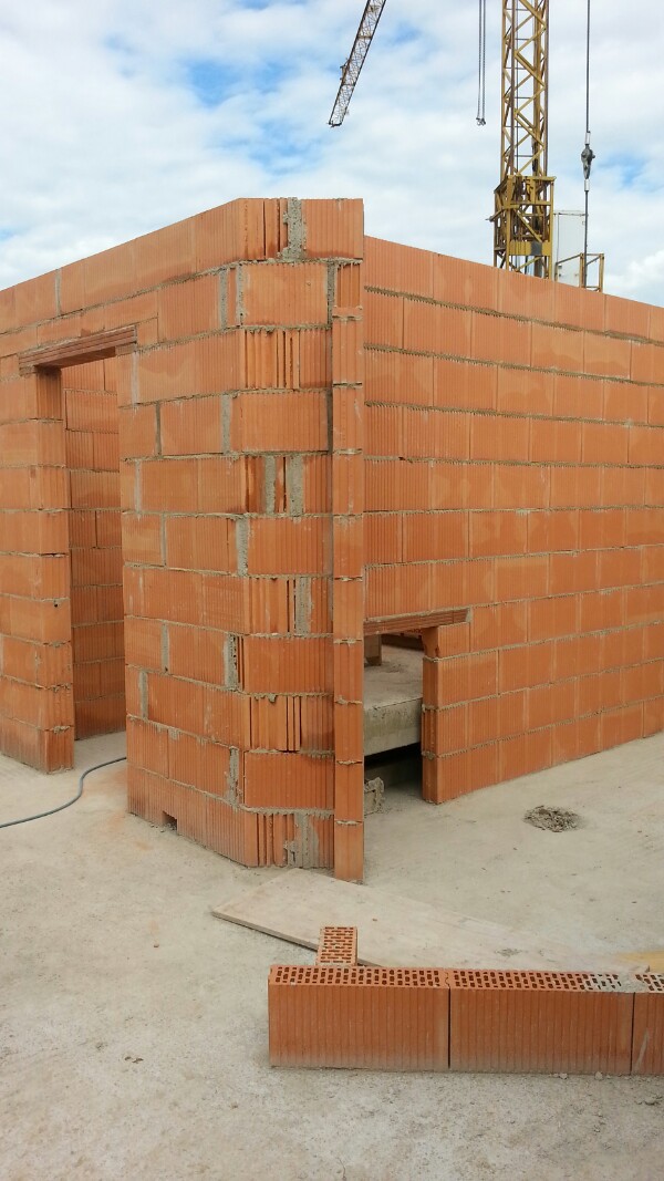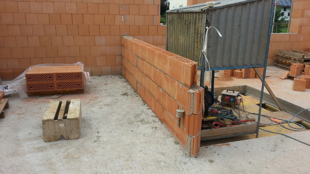 Heute wurde wieder fleißig gemauert. So sind nun die Obergeschossinnenwände Richtung Süden, die die beiden Kinderzimmer vom Büro trennen, fertig. Dabei wurde auch eine Aussparung für den Fußbodenheizungsverteiler vorgesehen.