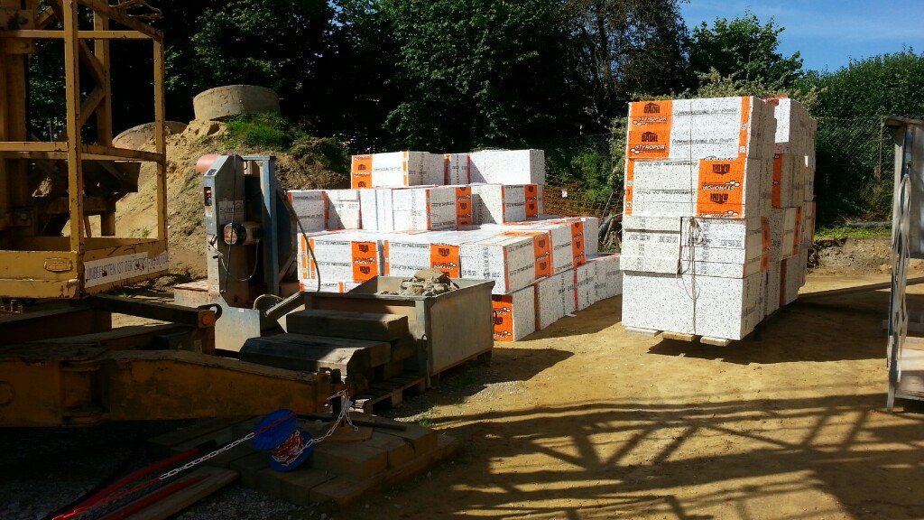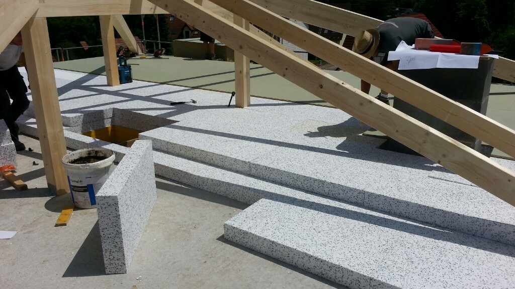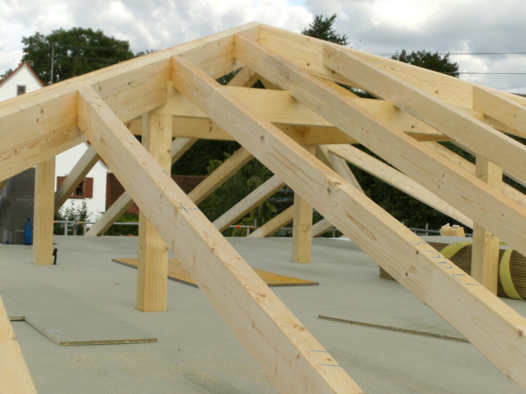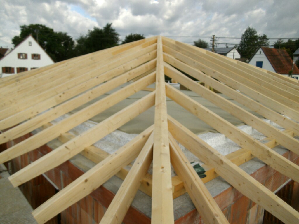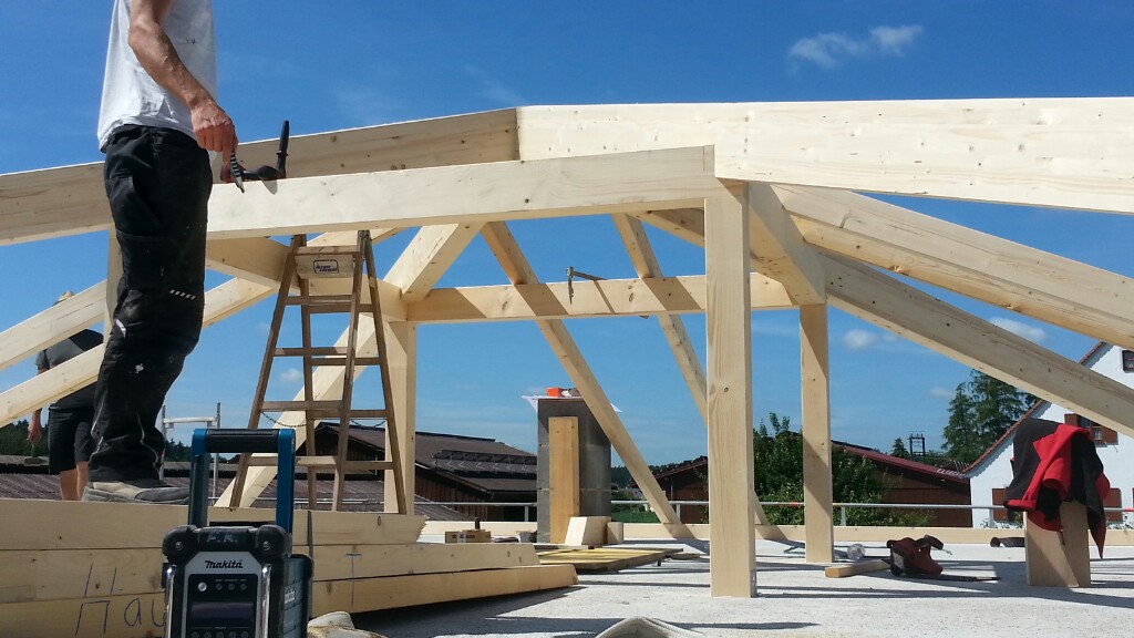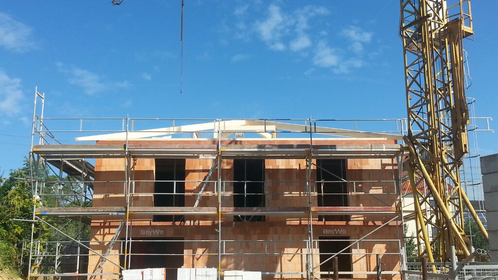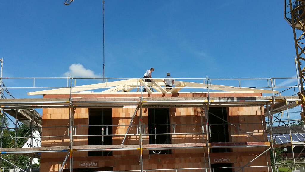 Heute war es nun soweit, zum ersten Mal rückten die Zimmerer an. In der Früh stand auch schon der LKW mit unserem Dachgebälk bereit. Schnell wurde alles abgeladen und der erste Teil auf unsere Obergeschossdecke gestellt. Während die Zimmerer damit begannen den inneren und äußeren Pfettenkranz aufzurichten, lasierten wir die Balken für Garagen- und Vordach. Schon rollte der nächste LKW an. Diesmal mit der Dämmung und den Spanplatten für unsere Dachisolierung.