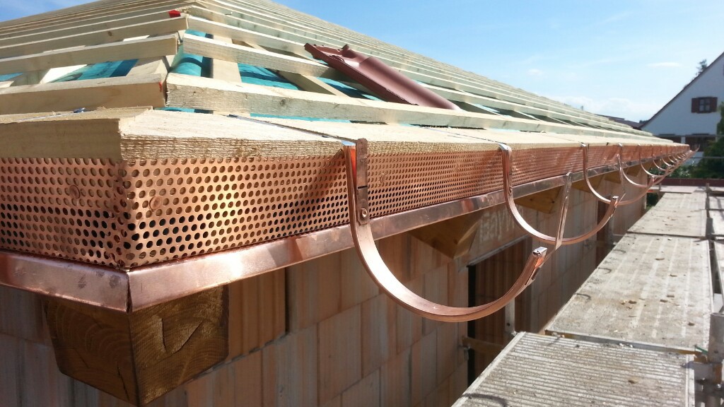 Heute war der Spengler weiter mit unserem Dach beschäftigt. Neben dem Insektengitter, das zukünftig z.B. Spinnen und Wespen davon abhalten soll, sich bei uns häuslich nieder zu lassen, brachte er die Halterungen für unsere Dachrinne an der Traufbohle an.