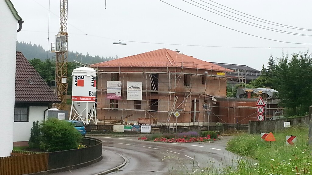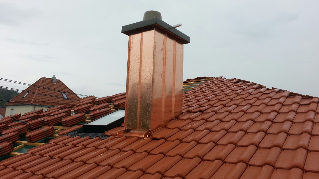 Heute verpasste der Spengler zunächst unserem Kamin noch eine hübsche Kupferverkleidung. Die Zimmerer bauten derweil die Dachluke ein, so dass der Kaminkehrer in Zukunft auch unsren Kamin kehren kann. Eine Revision von außen, über eine Leiter auf das Dach ist laut BG nur möglich, wenn eine fest installierte Leiter mit Rückfallsicherung am Haus montiert ist. Dies liegt daran, dass die Höhe unserer Traufkante über 5m liegt.