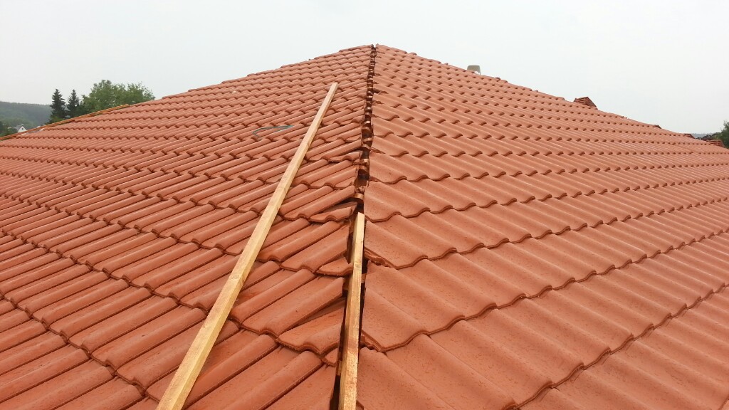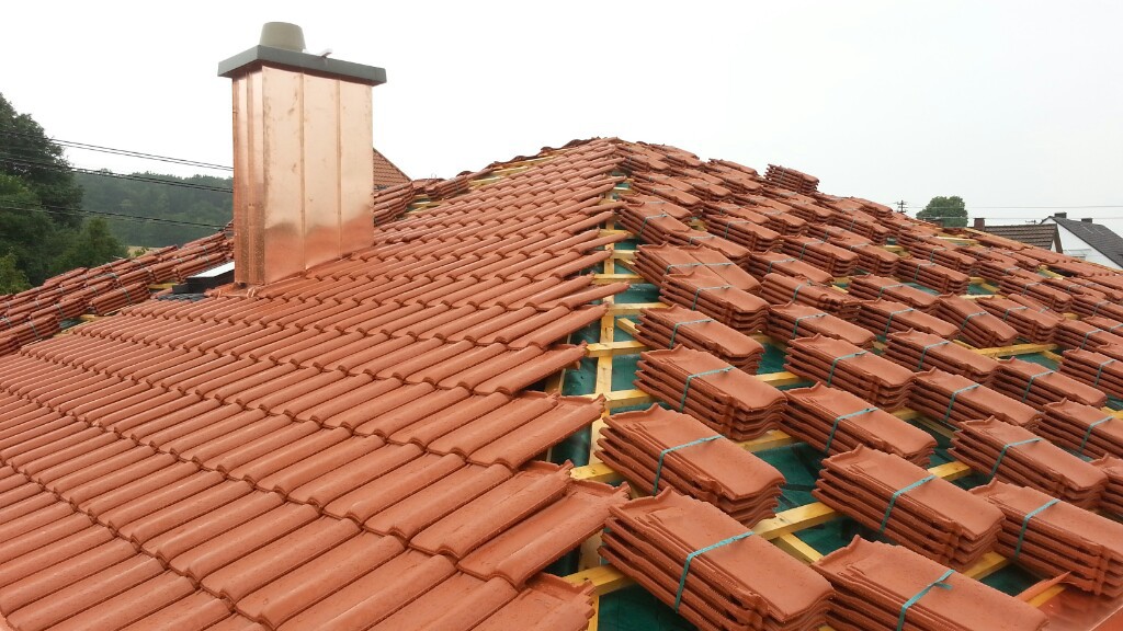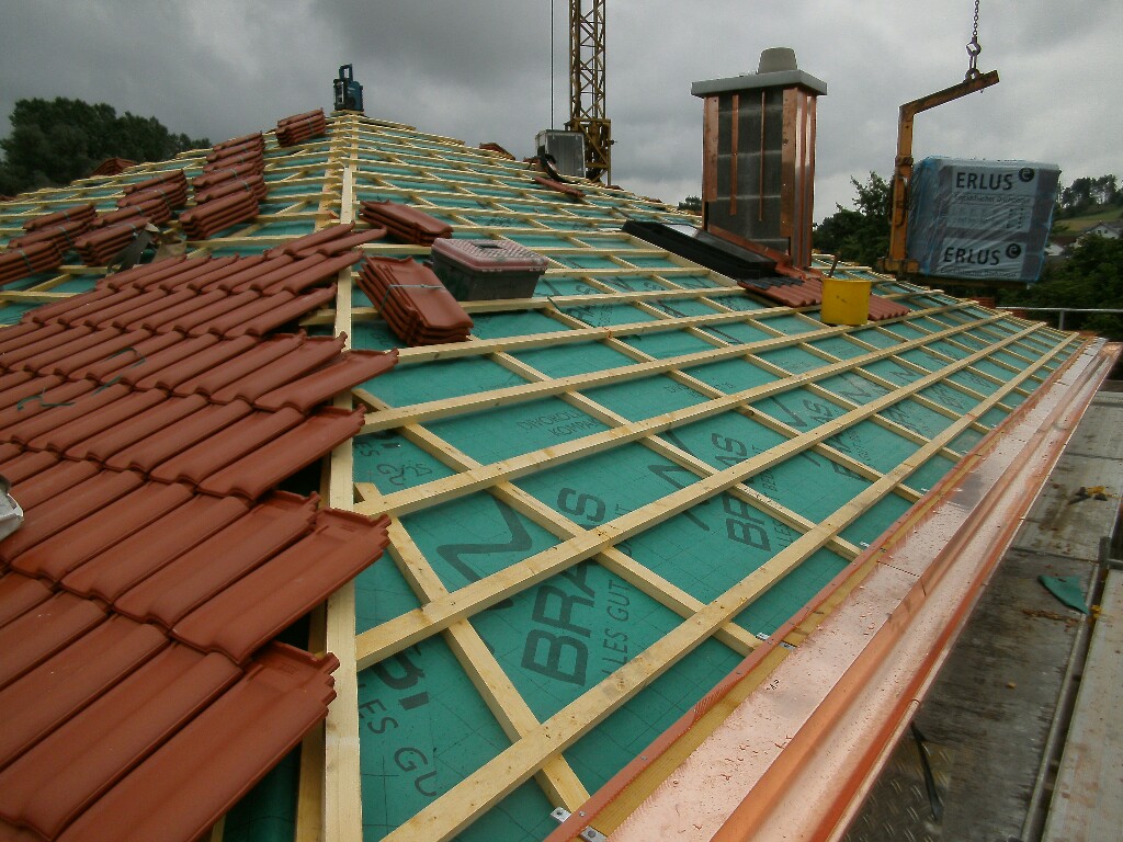 Abschließend wurden die Dachziegelpäckchen auf der Lattung verteilt und es wurde mit dem Dachdecken begonnen.
