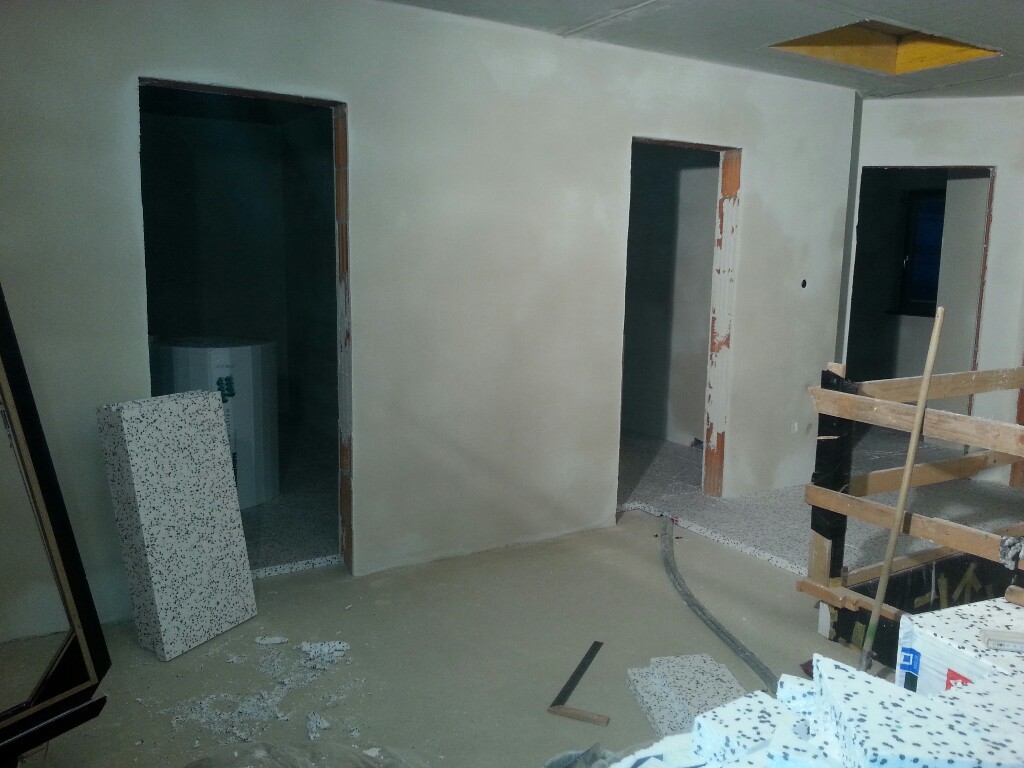 Bevor der Estrich verlegt werden kann, muss zunächst noch eine Isolierung, eine Trittschalldämmung die auch als Trägerplatte für die Fußbodenheizung dient und die Fußbodenheizung selbst, verlegt werden.