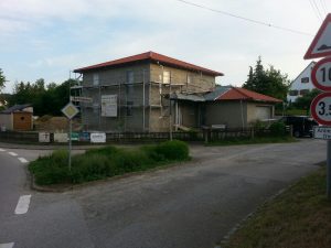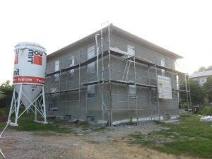 Im Laufe des Tages wurden die Westseite der Garage, sowie West-/ und Südseite des Hauses mit der ersten von insgesamt drei Putzschichten verputzt. Der Unterputz selbst besteht im oberen Teil des Hauses aus einem Faser Leichtputz. Der letzte halbe Meter, im unteren Sockelbereich, ist als Zementputz ausgeführt.