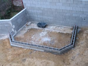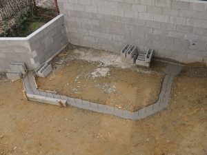 Nach armieren und betonieren des Fundamentes wurde die erste Reihe Schalbetonsteine in ein Mörtel-Bett gesetzt.