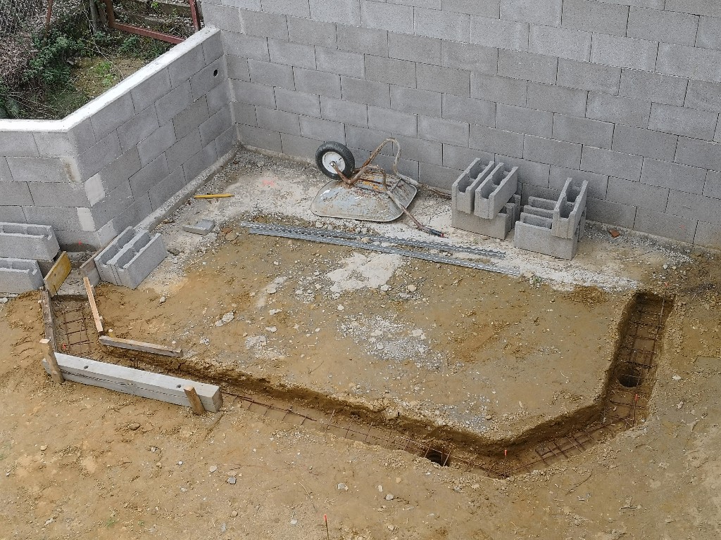 Nach armieren und betonieren des Fundamentes wurde die erste Reihe Schalbetonsteine in ein Mörtel-Bett gesetzt.