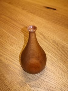 So entstand aus dem ersten, gestockten Buchen-Rundling eine kleine Vase. Das zweite Stück Brennholz habe ich zu einer Zierdose „verhackstückt“.