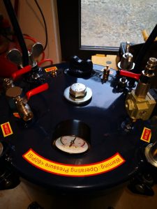 Zunächst bestellte ich mir einen 30l Pressure-Pot. Diesen Drucktank eines Airless-Lackiersystems baute ich so um, daß ich mein Werkstück bei bis zu 3,5 bar Druck über viele Stunden, ja so gar mehrere Tage trocknen lassen kann. Bei diesem Trocknen unter Überdruck werden Luftblasen im Harz bis zur Unsichtbarkeit komprimiert. Das Ergebnis ist ein absolut sauberer und „Lufteinschluss-freier“ Guss.