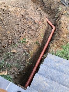 Da wir ja geplant haben, irgendwo im Garten ein Gartenhaus, für Rasenmäher, Werkzeug und Gartengeräte, sowie ein Gemüsebeet, Hochbeete und Gewächshaus zu platzieren, habe ich vorsorglich ein 100er KG-Rohr, als Leerrohr vom Keller unter der Terrasse durch bis in den Garten verlegt. Ebenfalls ist ein Wasseranschluß an der Terrassenmauer vorhanden.