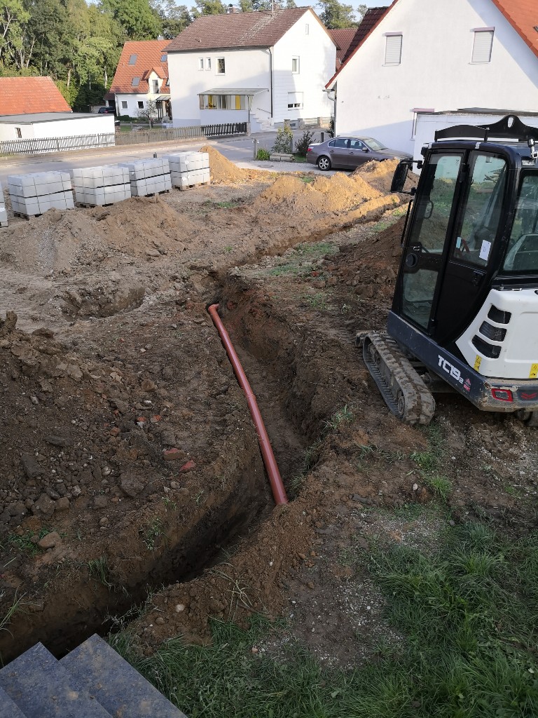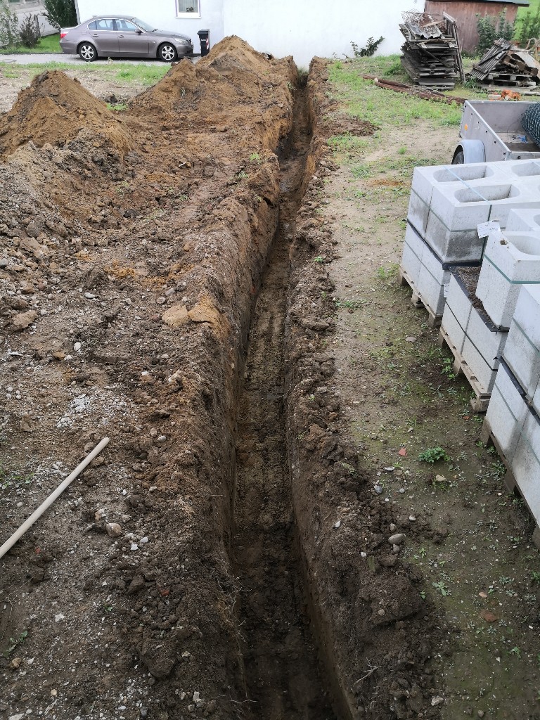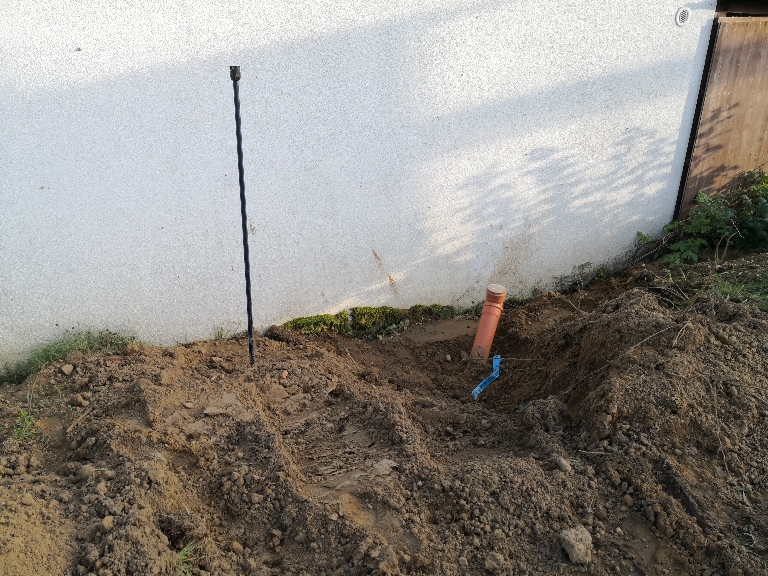 Da wir ja geplant haben, irgendwo im Garten ein Gartenhaus, für Rasenmäher, Werkzeug und Gartengeräte, sowie ein Gemüsebeet, Hochbeete und Gewächshaus zu platzieren, habe ich vorsorglich ein 100er KG-Rohr, als Leerrohr vom Keller unter der Terrasse durch bis in den Garten verlegt. Ebenfalls ist ein Wasseranschluß an der Terrassenmauer vorhanden.