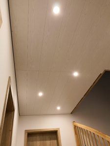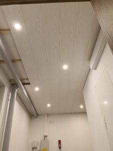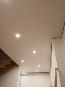 Da wir die Lattung bereits vor unserem Einzug an die Decke gedübelt hatten, konnte ich direkt mit dem Verlegen der Paneele und dem Einbau der Deckenspots beginnen. Zum automatischen Schalten der Deckenbeleuchtung kommen auch im Kellergang wieder Radar-Bewegunsmelder zum Einsatz. Auch bei dieser Decke müssen wieder einige Bretter, vor allem im Bereich der Wasserrohre und des Treppenauges genau eingepasst werden.