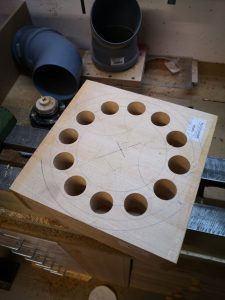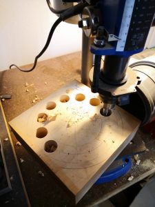 Da der Schalenrohling mit 20cm Durchmesser ca. 6,5cm stark war, bohrte ich 5,5cm tiefe Sacklöcher.