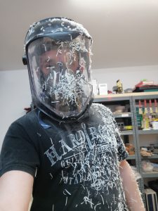 Das „tolle“ an Epoxydharz ist, daß beim Bearbeiten so lustige Späne entstehen. Diese kleben danach nicht nur an Maschine und Werkzeug, sondern auch am Drechsler…. 😀
