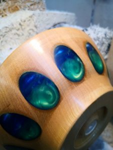 Die Löcher wurden im zweiten Schritt mit blauem und grünem Epoxidharz aufgefüllt.